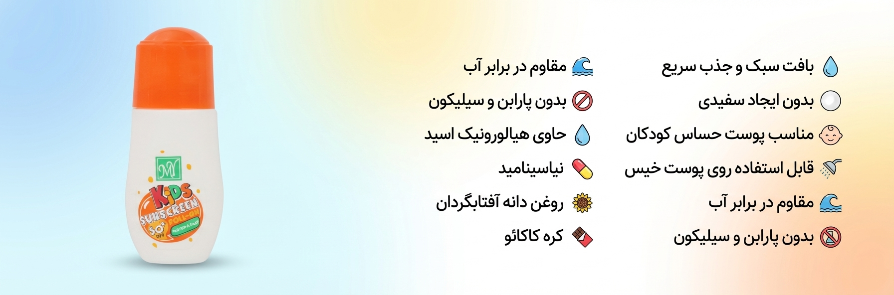 یکی از دغدغههای ما در ساحل یا استخر، استفاده از کرم روی پوست خیس است؛ خبر خوب این که این محصول به راحتی روی پوست خیس هم قابل استفاده است! لازم به ذکر است که تمامی محصولات سایت آفتابکده، از جمله این رول بینظیر، ابتدا توسط همکاران متخصص پوست ما بررسی شده و پس از تایید کیفی در سایت قرار میگیرند تا خیالتان از بابت سلامت پوست کودکتان کاملا راحت باشد.