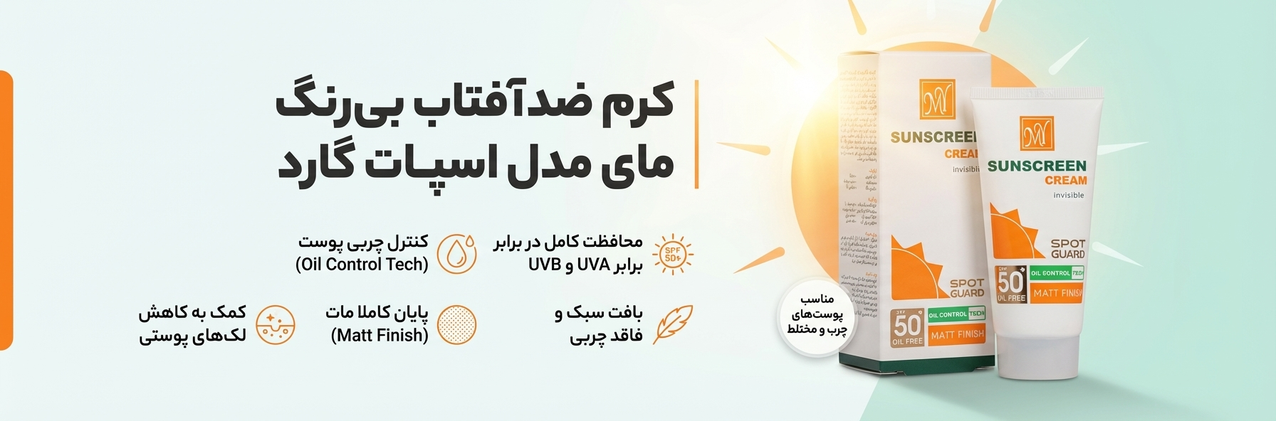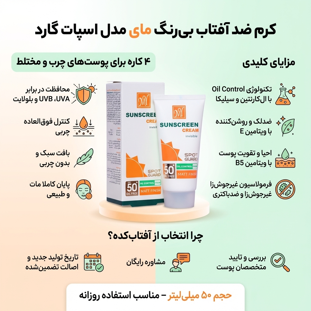 سلام به همراهان عزیز سایت آفتابکده. من به عنوان متخصص پوست مجموعه، قصد دارم یکی از محصولات بسیار باکیفیت برای پوستهای چرب و مختلط را به شما معرفی کنم. کرم ضد آفتاب بی رنگ مای مدل اسپات گارد، یک محصول ۴ کاره فوقالعاده است که با بافت سبک و فاقد چربی خود، به هیچ وجه روی پوست احساس سنگینی ایجاد نمیکند.